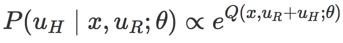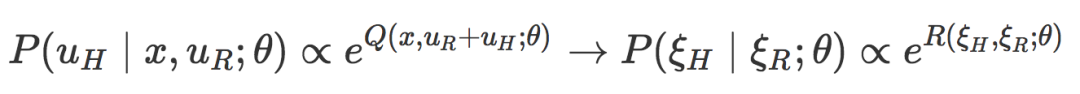 正如我们讨论的,机器人应该观察人类的动作来推理位置的任务目标。为了把机器人测量的直接人力与目标函数联系起来,机器人采用了观测模型。在最大熵逆强化学习(IRL)(https://www.aaai.org/Papers/AAAI/2008/AAAI08-227.pdf)中的现有工作和人类行为认知科学模型(http://web.mit.edu/clbaker/www/papers/cogsci2007.pdf)中的玻尔兹曼分布的基础上,我们将人类的干预建模为:机器人在处于状态 x 并采取 uR+uH 的行动时,能够将机器人期望的奖励近似最大化的矫正。这个期望的奖励包含即时奖励和未来奖励,并且由 Q 值描述。