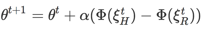 在每一个时间点,机器人会根据其当前最优轨迹和人类的偏好轨迹之间的累积特征差 来更新它对θ的估计。在示例学习的文献中,这个更新规则类似于在线最大间距规划(https://www.ri.cmu.edu/pub_files/pub4/ratliff_nathan_2006_1/ratliff_nathan_2006_1.pdf);它也类似于合作学习(https://arxiv.org/pdf/1601.00741.pdf),在合作学习中,人类会修正当前任务的轨迹点来为未来的任务学习一个奖励函数。