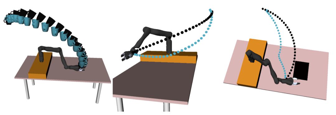 图 2. 初始目标函数被标记为黑色的线,真实目标函数的期望轨迹标记为蓝色线条。参与者需要校正机器人,教它将杯子保持直立(左边),使其朝着桌子移动(中间),并避免经过笔记本电脑(右边)。