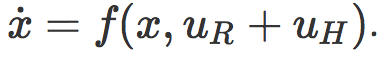 我们将会集中讨论这种方法的两个部分:(1)目标函数的结构;(2)机器人通过给定的人类物理交互推理目标函数的观察模型。让 x 代表机器人的状态(例如位置和速度),uR 代表机器人的动作(例如施加到关节的扭矩)。人类可以通过外部的力矩来与机器人产生物理交互,称作 uH,机器人通过它的动力运动到下一个状态。