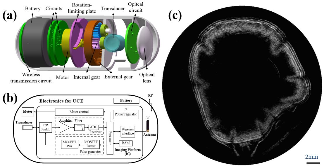 高分辨率超声成像技术在内窥镜领域具有重要的应用潜力,邱维宝课题组在推进血管内超声成像技术的同时,也在尝试新型内窥成像技术。胶囊内窥镜(capsule endoscopy)是一种胶囊形状的内窥镜,它是用来检查人体肠胃的医疗仪器。胶囊内窥镜体积仅有普通胶囊大小,消除了传统检查耐受性差的缺点,能够拍摄食道、胃、小肠、大肠等,从而完成对人体整个消化道的检查。然而目前该技术是采用光学成像方法,仅能观测组织表层的病变信息,不能获得深层次的组织情况。由于超声成像技术的穿透性较好,因此课题组拟尝试进行超声胶囊内窥镜的设计验证,提出了基于高分辨率超声的内窥成像控制方案,采用40MHz的超声频率获得了小于60微米的肠道组织成像分辨率。相关研究成果发表于 IEEE Trans Med Imaging 。