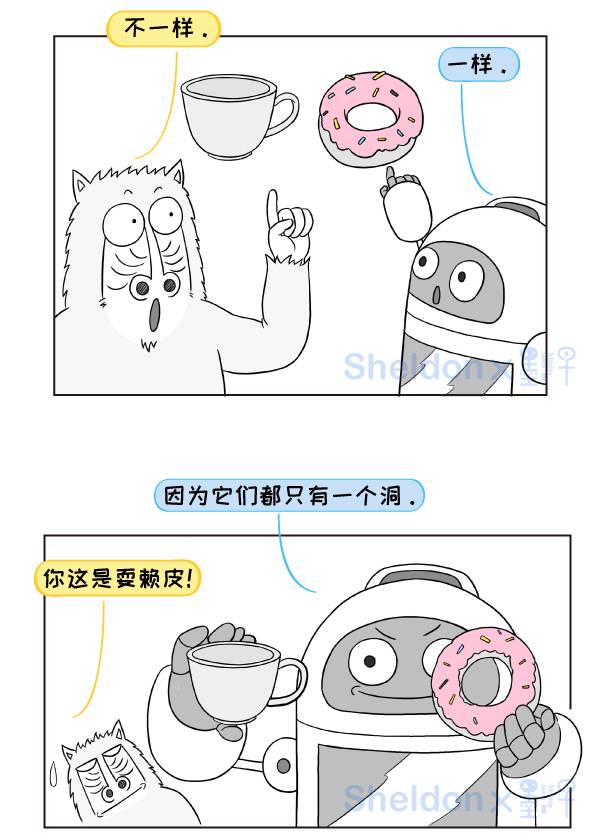 比方说,这里有一个面包圈,还有一个咖啡杯。你说它们两个长得一样不一样?