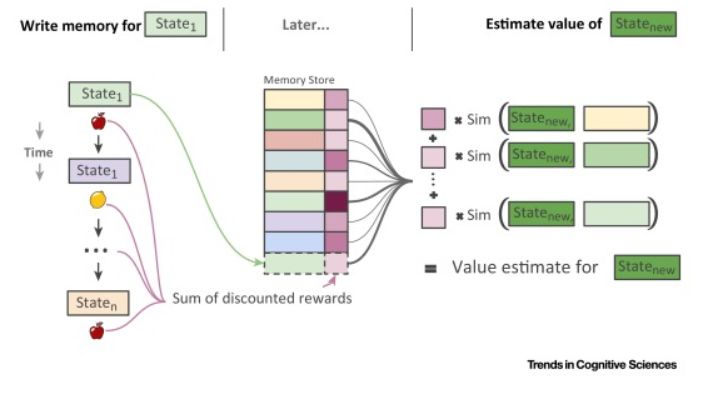 最近的研究表明,另一种方法也可以实现相同的目标,即保留过去事件的明确记录,并直接将此记录用作制定新决策的参考点。这种方法称为episodic RL,与机器学习中的“非参数”(不对目标函数的形式作出强烈假设)方法相似,如K近邻算法,也类似于心理学中学习理论的“实例”或“范例”教学。