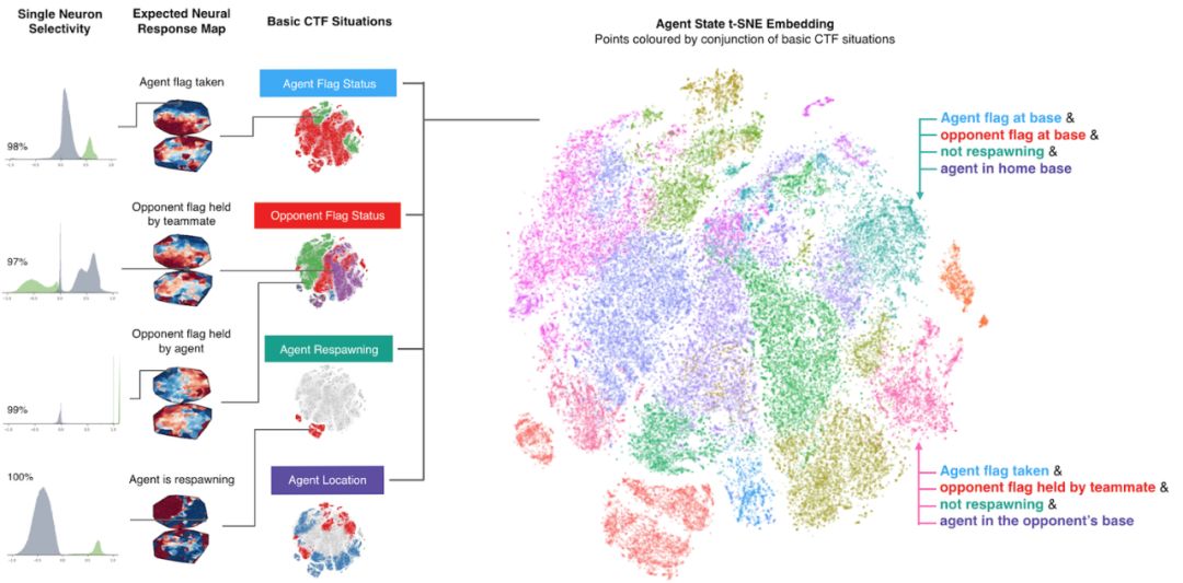 为了理解智能体如何表示游戏状态,我们来看一下在平面上表示的智能体神经网络的激活模式。下图中的点集群表示在游戏期间与附近表示类似激活模式的点的游戏情况。这些点按照智能体发现自己的高级CTF游戏状态着色:在哪个房间?旗帜的状态是什么?可以看到哪些队友和对手?我们观察到相同颜色的聚类,表明智能体以类似的方式表示类似的高级游戏状态。