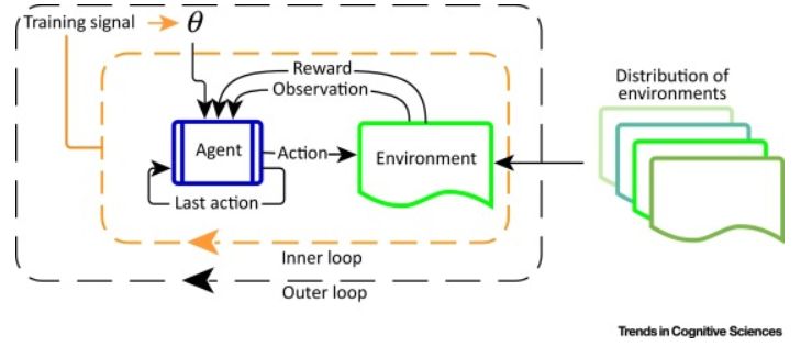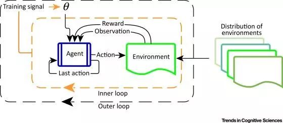 Wang 等研究者提出,Meta-RL 可以模拟生物大脑进行学习。他们认为以前额皮层(PFC)为中心的复位神经网络实现了学习的内循环,并且这种内循环算法由多巴胺驱动的突触可塑的外环慢慢形成。