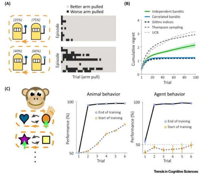 再说meta-RL,它对心理学和神经科学也有值得注意的潜在影响。有研究提出了从meta-RL的元素到神经结构和功能的直接映射。一系列计算机模拟表明, meta-RL可以解释行为和神经生理学中的各种实证研究结果。