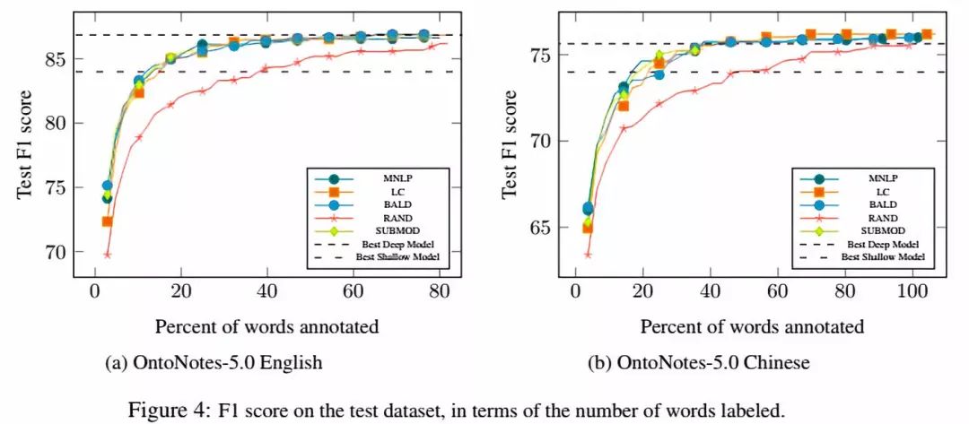 使用三种选择策略进行主动学习,所有算法都以相同的原始训练数据的1%作为初始数据集,随即初始化模型。 在每一轮中,每个算法都会从剩余的训练数据中选择句子,直到选择了20,000个单词为止。