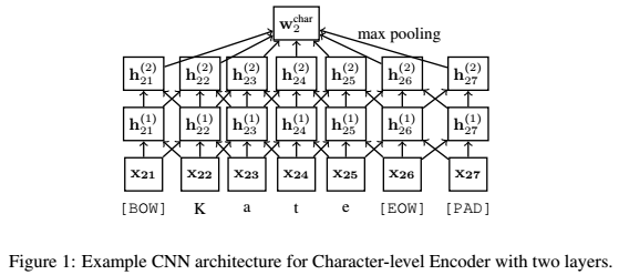 使用CNN进行字符级编码,虽然效果略逊于LSTM,但优点在于计算成本低。在两层CNN之间应用ReLU和dropout,在最后添加max-pooling层,得到character特征。