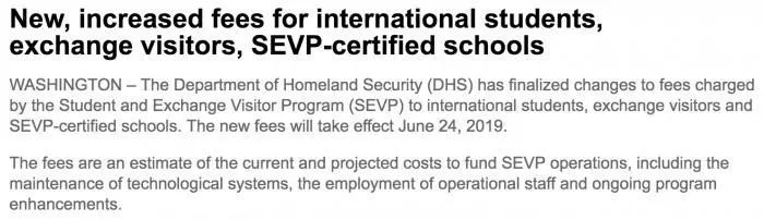 近日,美国国土安全部旗下的移民和海关执法部在其官网宣布,将调整“外国学生和访问学者计划(Student and Exchange Visitor Program)”(SEVP)下的各项收费。