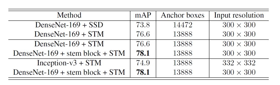 可以看到,DenseNet-169+STM的性能优于DenseNet-169+SSD的性能。