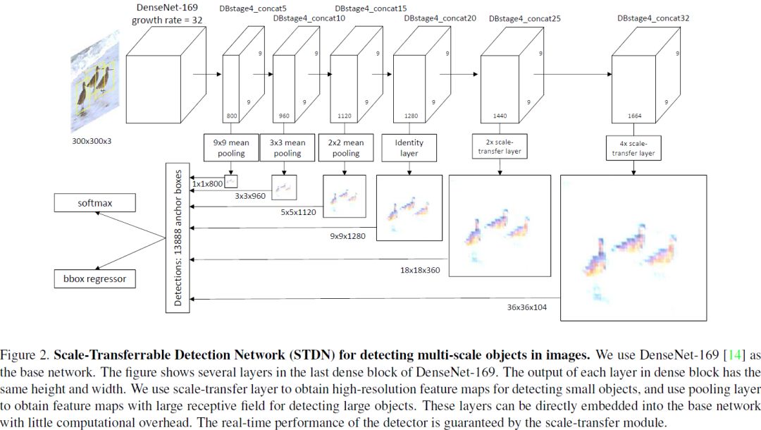 作者使用STM构建了一个一阶段的目标检测器,命名为:Scale-Transferrable Dtection Network (STDN),图2为本文提出的网络结构,因为DenseNet中最后一个dense block的最后一层的特征图有很多通道,scale-transfer通过压缩特征图的通道来扩张特征图的宽和高,这可以有效降低下一个卷积层的参数数量。