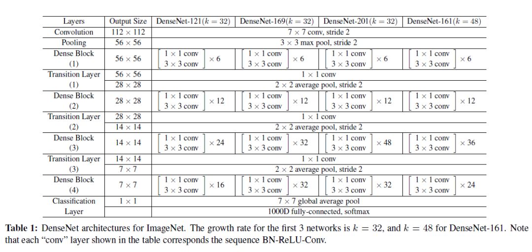 如上图所示,denseNet的每个dense block中,每层特征图都是接下来层的输入。而denseNet最后一个dense block中的最后一层特征图的通道数量很大,特别适合作为作者提出的scale-transfer层的输入,为什么这么说呢,因为scale-transfer通过压缩特征图的通道来扩张特征图的宽和高,所以通道数不能太少,如果太少的话就不够拿来扩张特征图了。DenseNet的网络结构为: