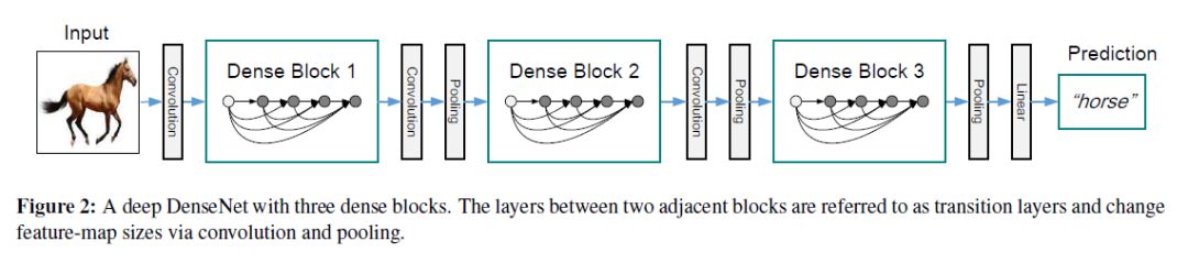 但其实,如果不同层的特征图不一样大时是没有办法直接连接的,因此这种想法直接应用于传统卷积神经网络是不合适的,因为down-sampling层会改变特征图的大小(注,对于卷积层,通过添加合适的padding,stride=1就可以保证前后特征图一样大),所以上图只是一个设想,但是要实现这种想法怎么办呢,作者将网络分成multiple densely connected dense blocks,在每个dense block中使用这种结构,也就是说每个dense block中的特征图都一样大,而不同dense block不一样大,这样即保留了传统卷积神经网络的特点,同时也最大程度的使用了shorter connection结构。