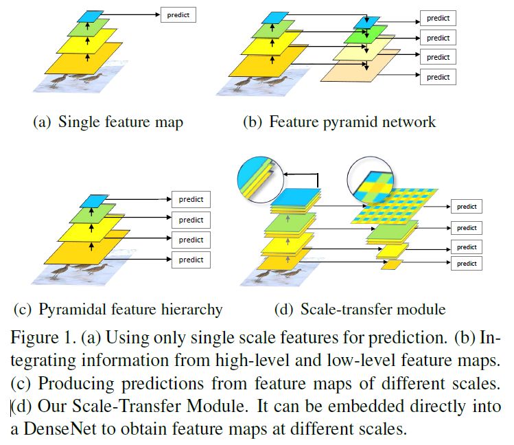 为了获得具有高水平语义信息的多尺度特征图,并且不损失检测器的速度,作者提出了一个Scale-Transfer Module (STM),并将这个模块直接嵌入到DenseNet中,DenseNet可以整合低层高层信息,以此得到更强有力的特征表示。STM包括pooling层和scale-transfer层,pooling层用来降低特征图的分辨率,scale-transfer层用来扩张特征图的分辨率,而且不会带来额外的参数和计算量。