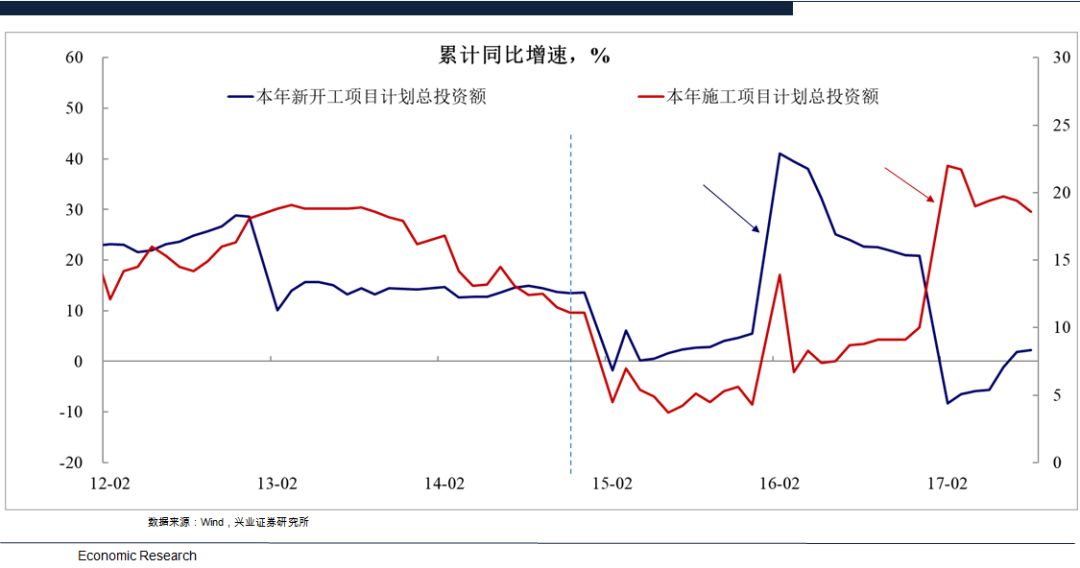 2016年初股市、汇市大幅波动,所以当时政府释放了大量的项目,新开工项目一下子跳到了40%左右。这个导致2017年在建工程增速是20%左右。现在的问题是2017年新开工只有2%-3%,那对应的是当把2012年开工的项目在2018年做完以后,在建工程肯定是回落的。
