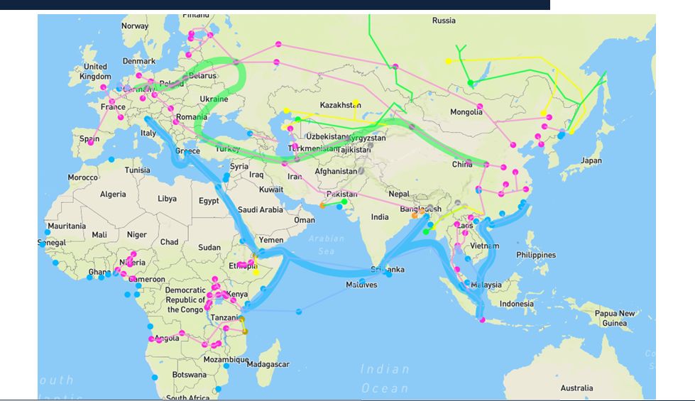 图中粉红色每一个点是交通的枢纽城市,粉红色这些线是铁路的支干线,欧亚非通过“一带一路”把它连出来。我们看路上这条线,这会改变什么?大家如果关心地缘政治的话,美国有一家智库叫CSIS。他们去年写了一篇年报,讲说中国的“一带一路”会产生什么样的影响。在这张图上,“一带一路”的很多线,这些线可以慢慢改。