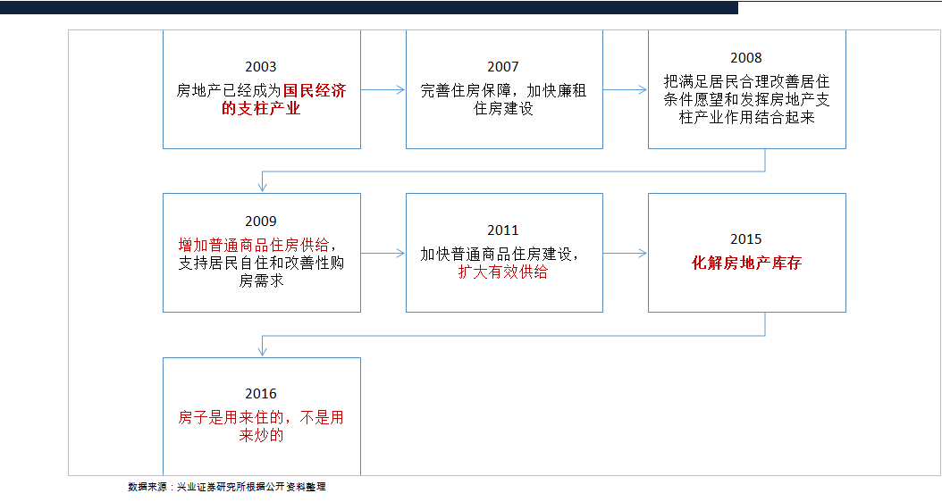 这是从2003年以来政府对于房地产定调的变化。2003年,政府说房地产是国民支柱产业,翻译一下就是2003年我们GDP很少,所以拉动GDP要靠房地产;到2007年,变成了加快住房建设,不提拉动GDP了。因为2007年GDP增速是10%几,GDP已经不需要房地产拉动。但是那个时候住房不够,所以需要增加供给,否则的话,房价压不住。所以增加供给这的说法,从07年讲到2011年,一直在讲扩大有效供给;到2015年,变成化解库存。
