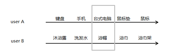 这是两个用户userA,userB在易购上面的消费time line,灰色方框内为我们观察对象,试问一下,如果换一下灰色方框内的userA、userB的购买物品,直观的可能性有多大?