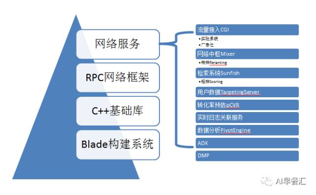 可以看一下,上面有流量接入的CGI,有一个实验系统,可以对系统变更做监测。里面有一个精排,可以对检索系统返回的广告做百里挑十、百里挑一的排序。所有这些服务都是基于同样的网络框架,所以可以做一个比较好的运维。