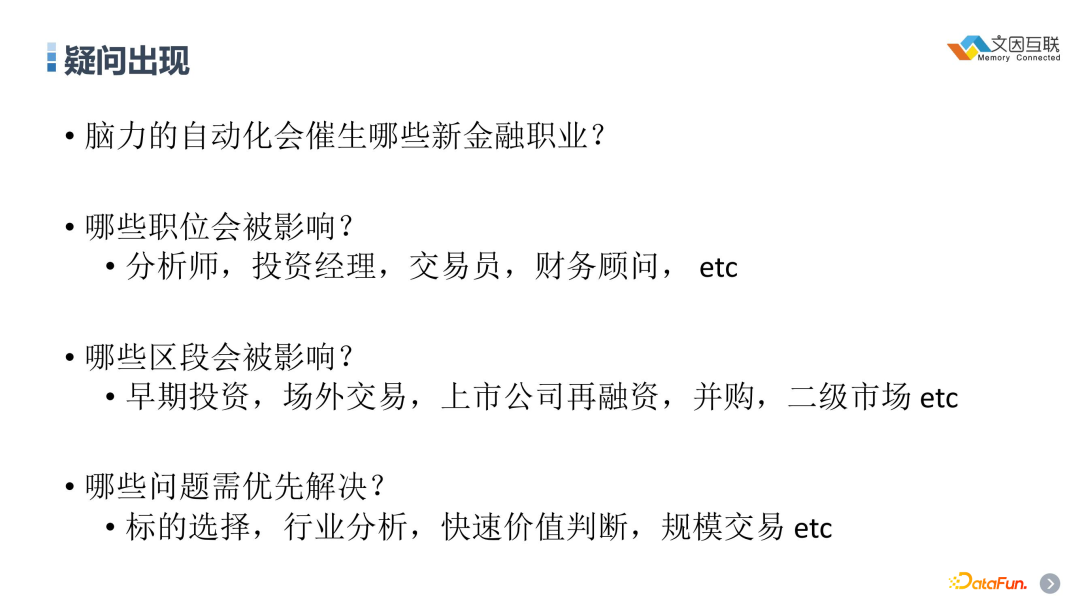 2016年3月9号AlphaGo打败了围棋冠军李世石,整个金融界完全被震撼,金融市场是程序化交易的天下,这一天成为知识图谱在金融领域的Big Bang,金融界有很多人提出了很多问题,问题大致分类如下: