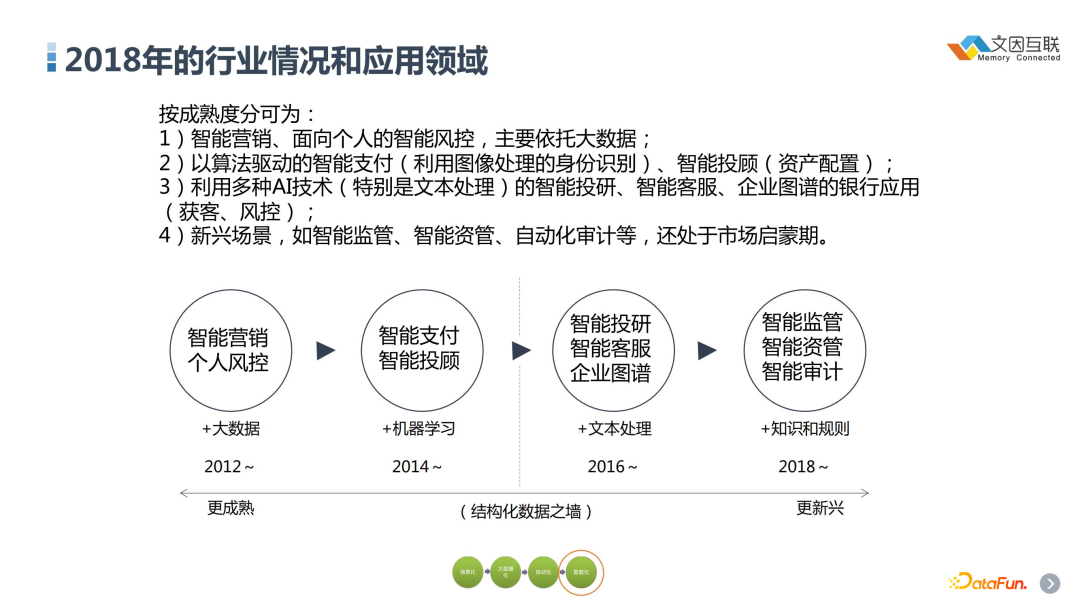 2018年在全国知识图谱与语义计算大会上成立金融知识图谱工作组,我们发现金融领域应用从利用技术角度可以分为四类:大数据技术、机器学习技术、文本处理技术,以及知识和规则技术。2016年以前我们基本以大数据技术和机器学习技术为主,在智能营销、智能支付、智能风控、智能投顾应用已经相比较成功。在智能监管、智能资管、智能审计、智能投研、智能客服应用遇到困难,难点在于结构化数据之前的文本信息,巧妇难为无米之炊。解决难点的关键是在提供优质的数据,必须解决文档自动化理解问题,成为整个行业的主旋律。