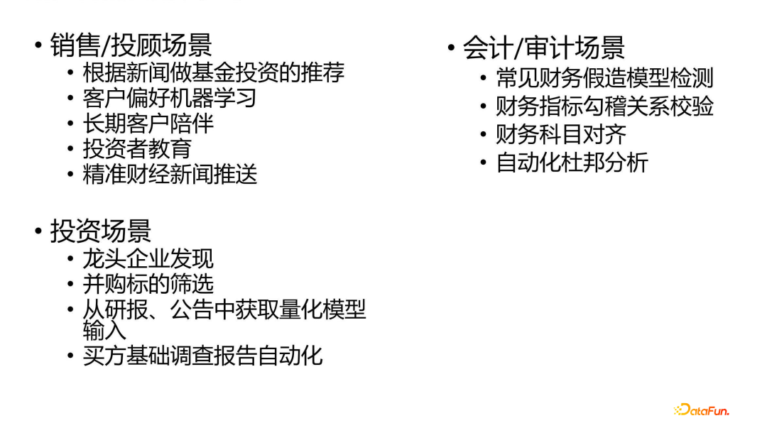 2018年随着整个国家金融转型,在监管、基础数据、资管、咨询、研究、销售、投顾、会计、审计、投资等10大应用领域新增非常多的细分场景,具体场景如下: