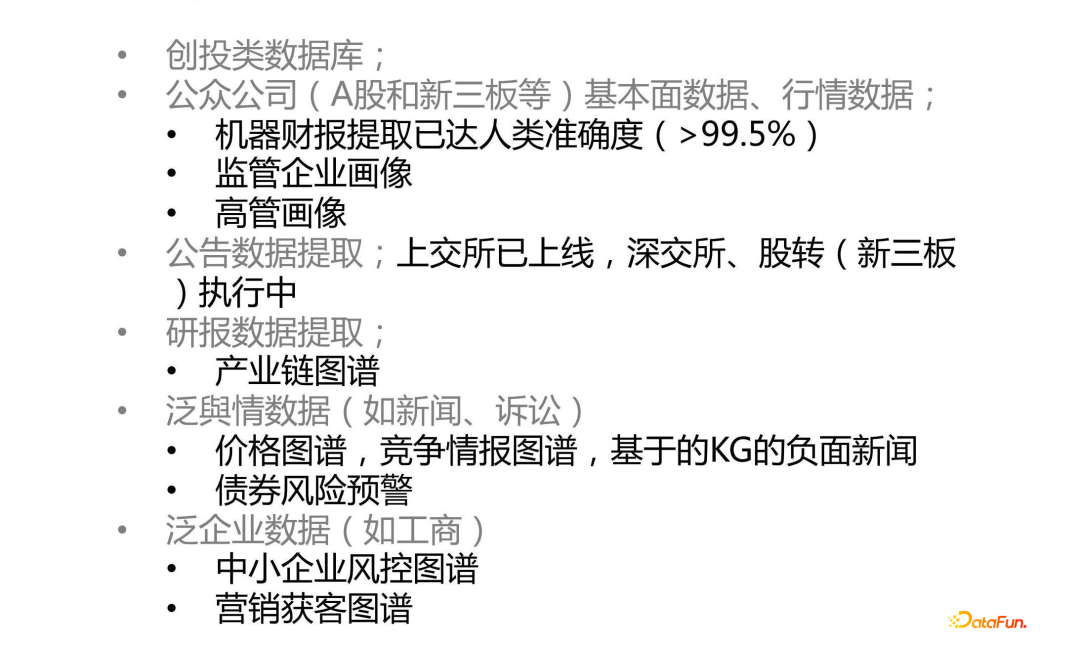 2017年知识图谱的场景较2016年有大幅扩展,除了创投数据库之外,有了公众公司的基本面的数据库,行情数据库,特别值得指出,2017年我们文因互联负责完成上交所的公告摘要项目,是国家第一个采用自然语言处理进行上市公告。2017年证明可以用机器去做公告数据提取、研报数据提取,还有舆情数据提取。同时还有其他的数据提取,例如工商数据,也就是泛企业数据。