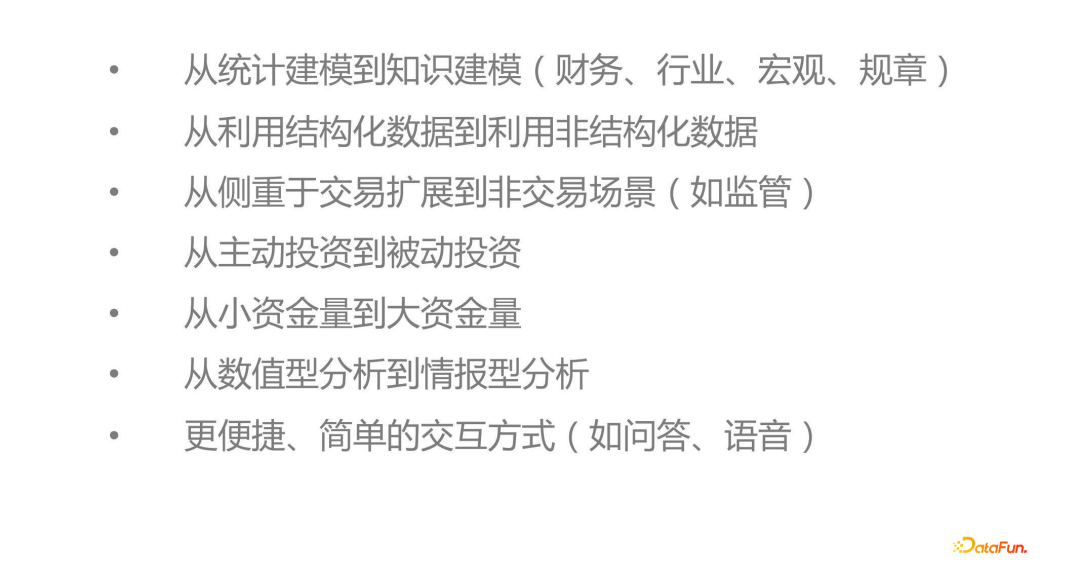 2017年知识图谱的应用系统丰富起来,看到传统数据终端可能会被替代,出现了金融搜索引擎、金融问答引擎、研报的公告摘要、脱水研报、脱水公告、自动化信贷流程,自动化评级流程,自动化写报告,自动化写新闻,自动化做审计等。