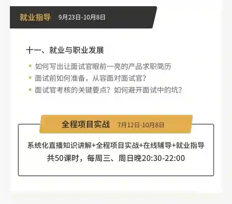 每周2次直播上课:周三、周日晚20:30-22:00,不耽误白天上班。错过直播还可以隔天观看回放。一共50课时,相当于再上了一次大学专业课。