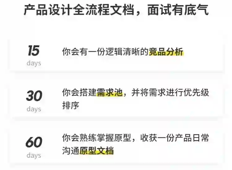 通过项目实战,你将经历一次规范的产品全流程。老师90天在线辅导,一步步拆解产品规划过程中需要注意的各种要点。你将完成竞品分析、产品规划roadmap,产品原型、PRD等产品必备文档,掌握产品核心工作能力。