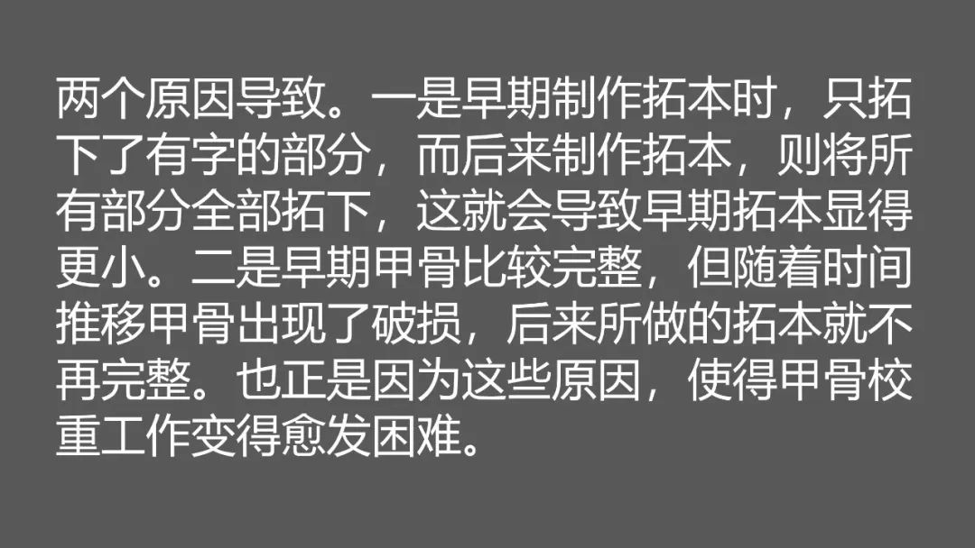 作为三千年前古人留下的一份礼物,每一片甲骨都弥足珍贵。但目前甲骨的研究主要依靠拓本图像,而非甲骨实物,所以拓本就是甲骨研究的根本出发点。很多时候一个字形、一条卜辞的清楚认知,就来自更全、更清的拓本材料。所以甲骨学家从不放过哪怕只有一个字的拓本。