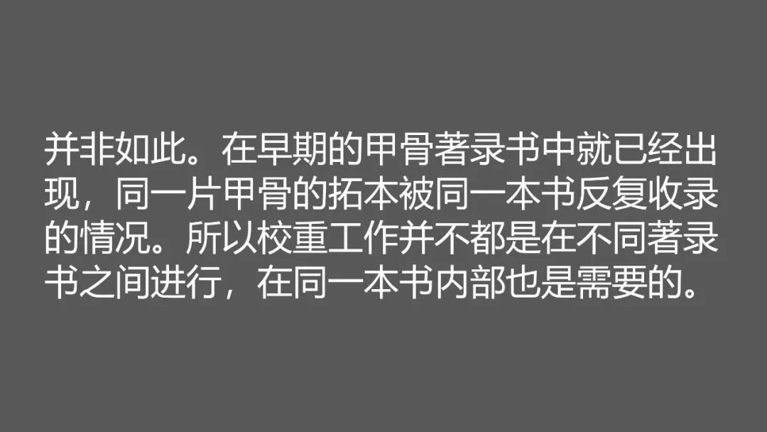“校重”是甲骨学领域的一个老题目,此前已经有很多甲骨学家为这项工作倾注了大量心血。比如甲骨文领域最重要的两部著录书《合集》《合补》,在编著过程中花费大量功夫做的工作就是校重。理论上来说,完成一张甲骨拓本的校重工作,应该将它与其余的所有甲骨拓本逐一比照,才能确保没有遗漏。尽管可以利用文字信息和分类方法缩小对比范围,但对于甲骨学家而言,这仍然是一项十分艰巨的工作,且难以保证全面性和准确性。