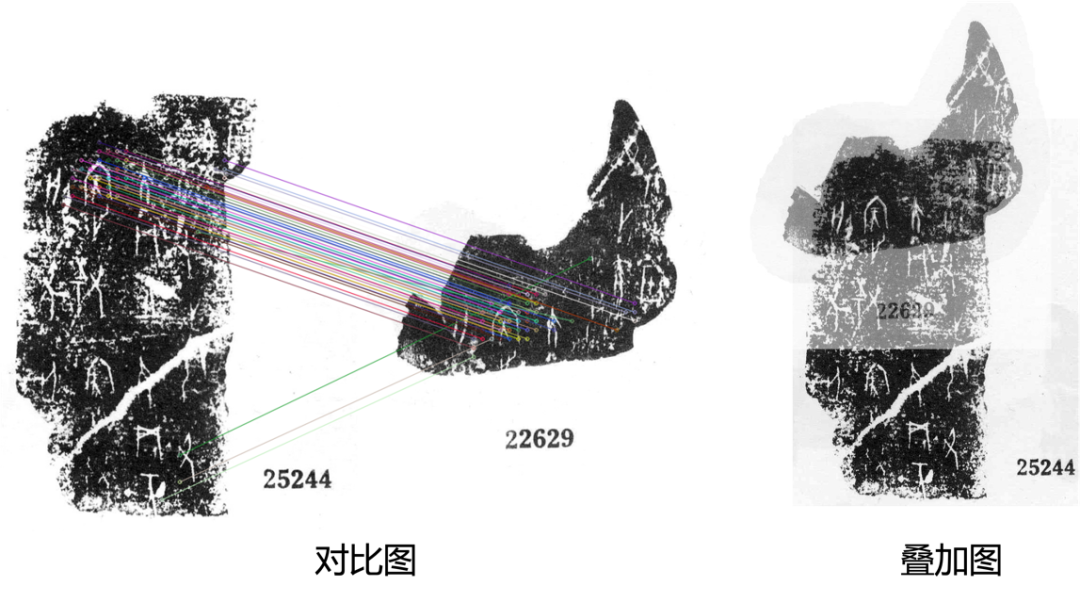 Diviner 模型另一个特点在于能够精确的预测出重片之间点对点的对应关系,并将重片拼合或拼接在一起。这种可以被专家快速解读的结果大大方便了人类与人工智能的协同合作。对于甲骨文这样的冷门绝学,人机合作尤为重要。在校重结果中,专家可以看到局部匹配细节和重叠图,极大地帮助并加速了他们验证的过程。