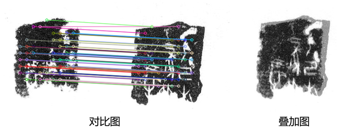 全局优化。基于密集的点与点的匹配结果,通过使用鲁棒的优化算法 RANSAC 估计全局的几何仿射变换。仿射变换允许模型在内容重复的情况下拼合或拼接已有图像。这种局部到全局的方法对检测大量的甲骨碎片至关重要。