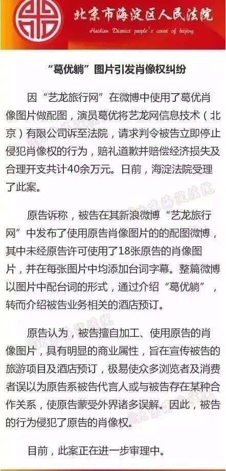 2016年12月,他将艺龙网信息技术(北京)有限公司诉至法院,后者因在官方微博中使用“葛优躺”表情作为配图,被法院判定“侵犯个人肖像权”,须赔礼道歉并赔偿相关经济损失40余万元。