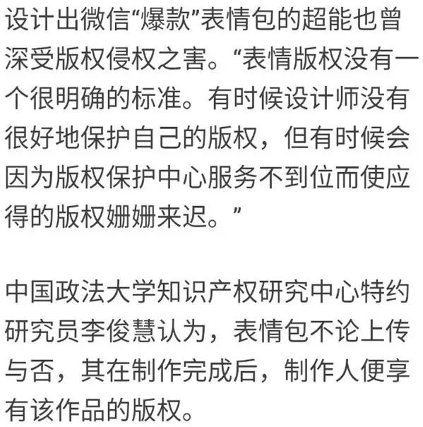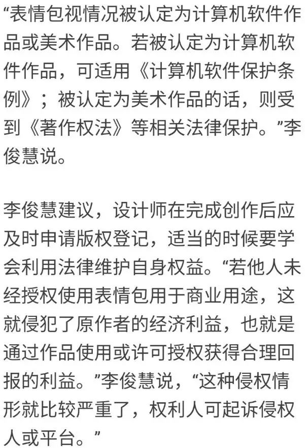 “如果截取表情包图像以商业使用为目的,未经肖像权人或其三代以内近亲属同意,就会构成对他人肖像权的侵害。”南京大学新闻传播学院教授陈堂发在接受检察日报记者采访时说,如果表情图形存在对权利人的不适当“艺术”处理,体现为一种“丑化、歪曲”的效果,可能构成对他人名誉权的侵害。