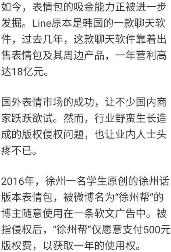 以日本的社交软件Line为例。Line软件向用户提供付费贴图表情包,每组贴图售价120-240日元不等。2016年,Line赴纽约上市。其上市披露文件显示,Line仅靠表情包出售业务,每年收入达到2.7亿美元,约合人民币17.8亿元!