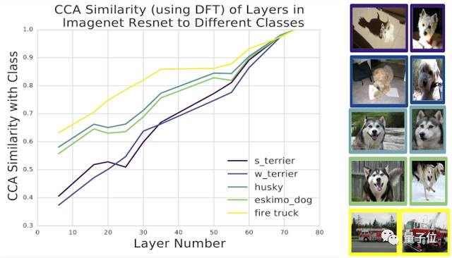 当我们把这种技术用到ImageNet训练的ResNet上时,可以看出潜在表示与不同类别对应的表示之间的相似性: