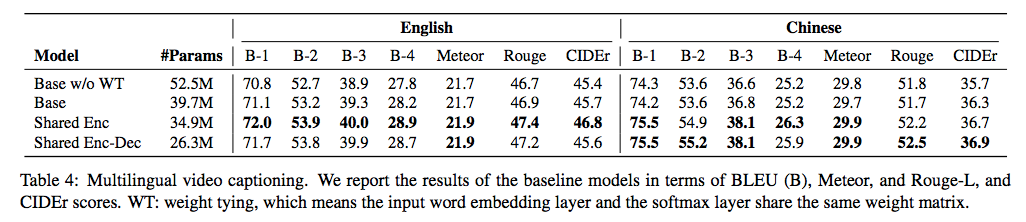 提出了多语视频描述任务,并使用紧凑的统一模型验证了其在生成中英文视频描述时的效率和效果。