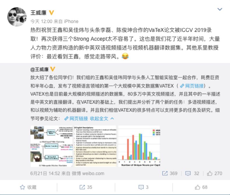 来自加州大学圣塔芭芭拉分校王威廉组的王鑫、吴佳炜与字节跳动人工智能实验室李磊、陈俊坤等人合作的 VATEX 论文被 ICCV 2019 接收,并获得三个 Strong Accept。此前,王鑫等人的视觉语言导航研究《Reinforced Cross-Modal Matching and Self-Supervised Imitation Learning for Vision-Language Navigation》在 CVPR 2019 评审过程中也获得三个 Strong Accept,最终获得了 CVPR 2019 最佳学生论文奖。