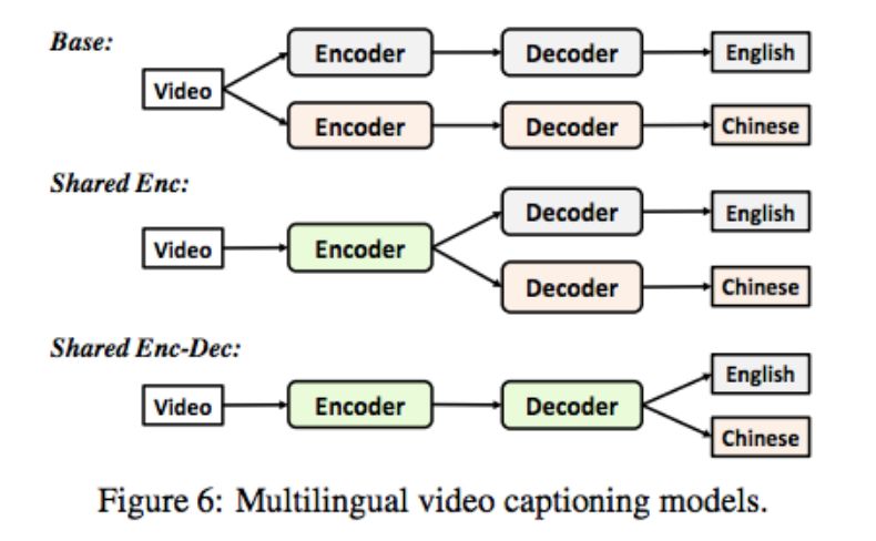 研究者还基于 VATEX 数据集提出了两项视频语言研究任务:1)多语视频描述,即使用紧凑的统一描述生成模型为视频生成多种语言的描述;2)以视频为辅助的机器翻译,即使用视频信息作为额外的时空语境将源语言描述翻译为目标语言描述。