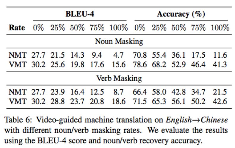 除了表 5 以 BLEU-4 为度量指标衡量模型性能之外,研究者还提出使用名词/动词恢复准确率(noun/verb recovery accuracy)来准确评估额外视频信息对恢复名词/动词的影响,名词/动词恢复准确率即目标句子中名词/动词准确翻译出来的概率。
