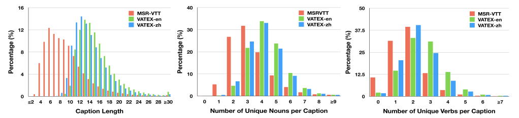 图 3 为 VATEX-en、VATEX-zh 和 MSR-VTT 的统计直方图分布。从中我们可以看到,相比 MSR-VTT,VATEX 数据集中的视频描述更长,且具备更多的名词和动词。