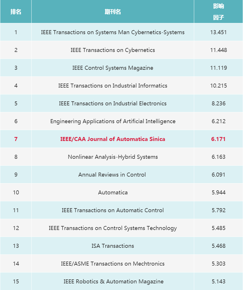 6月30日,科睿唯安发布2020年度《期刊引证报告》 (Journal Citation Report)。自动化所主办期刊IEEE/CAA Journal of Automatica Sinica(《自动化学报》(英文版),简称JAS)最新SCI影响因子6.171,在自动化与控制领域全球63种SCI期刊中排名第7,位列前11%。