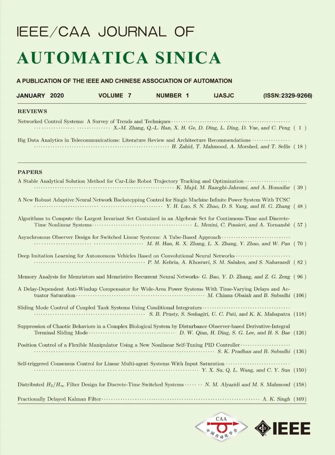 IEEE/CAA Journal of Automatica Sinica(《自动化学报》(英文版),简称JAS)报道自动控制、人工智能、机器人等领域热点和前沿方向的研究成果。目前,JAS被SCI, EI, Scopus等数据库收录,是中国科技核心期刊、ESI刊源期刊,是自动化与控制系统领域唯一的中国主办Q1区SCI期刊,也是谷歌学术计量自动化与控制理论学科TOP20出版物中全球最年轻且唯一中国主办的期刊。2019年,JAS首个SCI影响因子为5.129,在自动化与控制领域全球63种SCI期刊中排名第11(前17%),位列Q1区;最新CiteScore为11.2,排名前5%,位于所属各领域Q1区前列。JAS为中国科技期刊卓越行动计划世界一流重点建设期刊,自首次参评以来连年荣获“中国最具国际影响力学术期刊”称号。