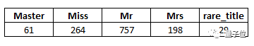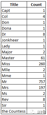 实际上,这些姓名可以分解为其他有意义的特征。比如,我们把相似称号提取并分到单个类别。下面是乘客姓名中各个称号的对应频率。