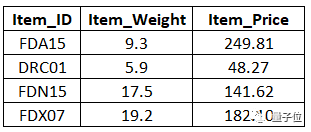 下面是一个样本数据,包括每个项目的详细信息,如它们的重量Item_Weight和价格Item_Price。