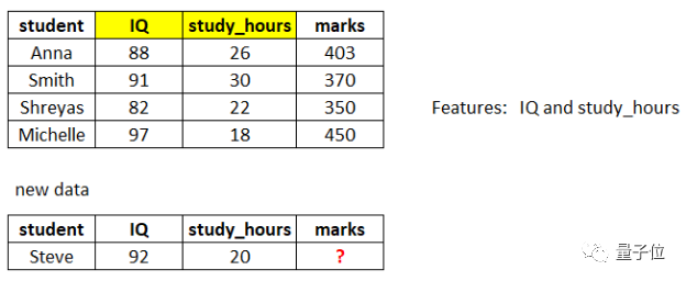 例如,在一个学生列表中,包含每个学生的姓名name、学习小时数study_hours、智商IQ和先前考试的总分数marks。现在给你一个新学生,他的信息只有学习小时数和智商,他的总分数缺失,你需要来估计他可能的分数值。