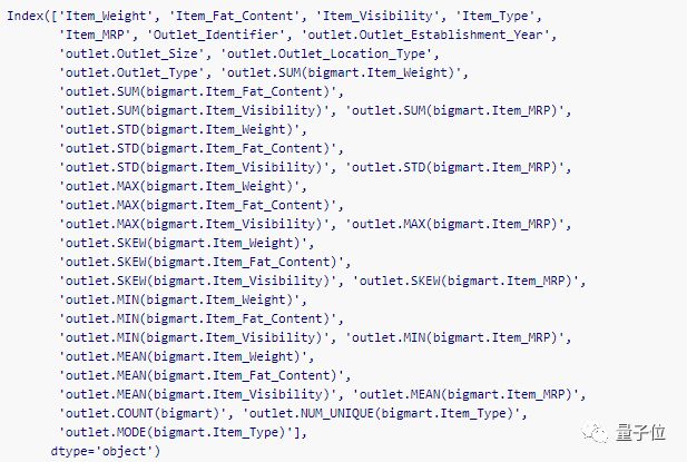 要注意,由于不再需要,我删除了特征Item_Identifier。但是,我保留了特征Outlet_Identifier,因为我稍后还要用到它。