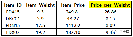 现在,我们可以使用重量和价格创建新特征,于是创建了一个名为Price_per_Weight的特征,它指的是物品的单位质量价格。这个过程叫做特征工程。